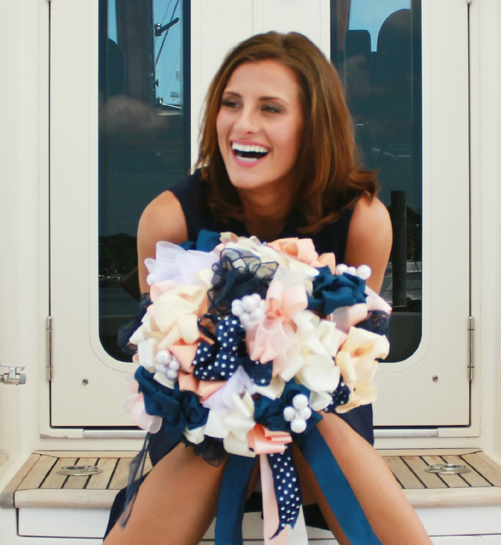 Russo was inspired to create this patented ribbon craft out of her own frustration with a decades-old tradition. During her friend's bridal shower, Russo found herself using a paper plate and scissors to create a bouquet of gift bows for the bride to carry during her wedding rehearsal. The flimsy paper plate ripped as the ribbon ends were threaded through and it bent under the weight of the bows. Thus, Russo's plan to escape the plate was born.