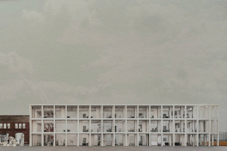 Shipyard grounds were also the subject of a diploma of Tomasz Zabłotny - the winner of the Gdansk Mayor's second prize. The young architect has created a vision of the office building on the site of the former, 19th century Imperial Shipyard - the oldest part of Gdansk Shipyard. The light, airy, office building made of glass is adjacent to the preserved waterfront shipbuilding halls with the very characteristic three shipyard cranes in the background. The new Waterfront district flawlessly connects the oldest part of the historic Imperial Shipyard with the Old City, preserving the exclusive identity of the place.